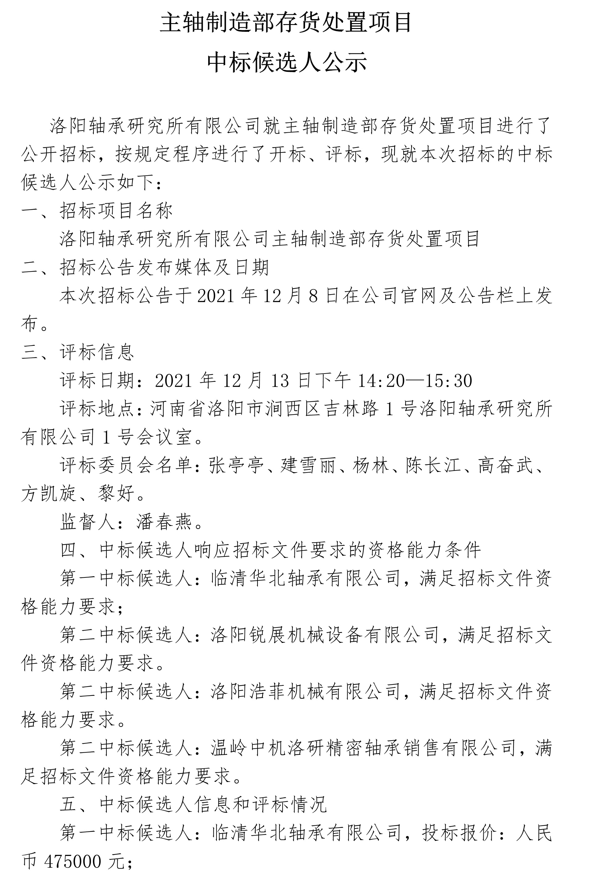 金屬原材料處置項目中標候選人公示